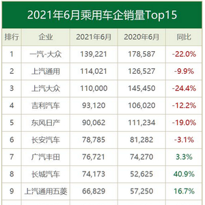 受到芯片供应不足影响,6月份国内乘用车销量同比下滑11.0%。头部车企中,合资品牌表现相对较差。其中,南、北大众以及北京奔驰下滑均超过20%,东风日产、广汽本田下滑达到19%。