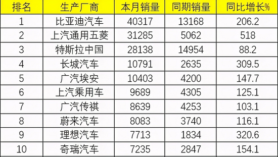 但自主品牌的新能源增势极为明显。6月,比亚迪新能源汽车销量突破4万辆,超越通用五菱排名第一,同比增速达到206.2%,成为拉动公司总销量高速增长的关键;长城新能源汽车销量达到10791辆,同比增长309.5%,表现同样不俗。