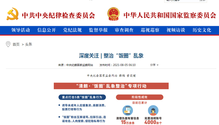 中央纪委国家监委网站8月5日早间发布文章,深度关注“饭圈”乱象整治。