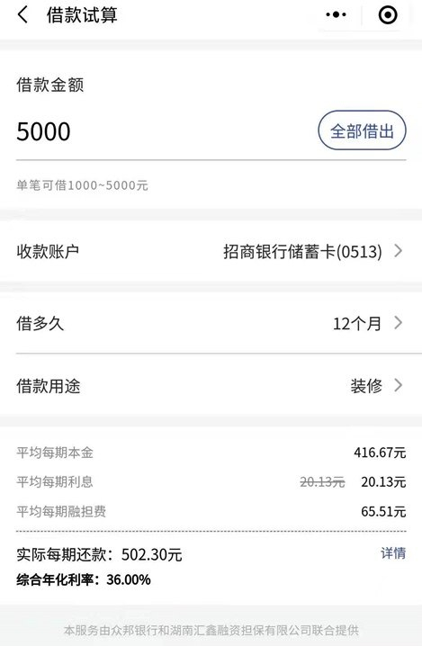因为有第三方机构“汇鑫担保”提供担保服务,众邦银行提供的贷款年利率高达36%(小编尝试申请获得5000元额度,借款试算详情显示,综合年化利率36%)。