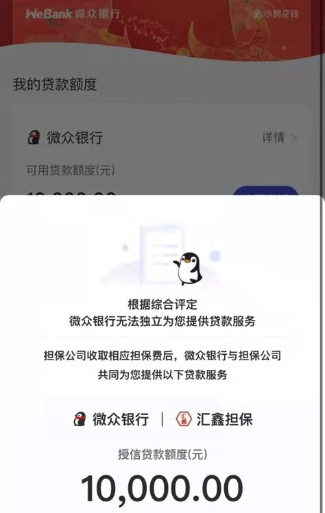 事实上,小鹅花钱也与汇鑫担保存在合作,遇到综合评分不足,但又不愿放弃用户,小鹅花钱提示“根据综合评定,微众银行无法单独为您提供贷款服务,担保公司收取相应担保费微众银行与担保公司为您共同提供以下贷款服务(1万元授信贷款额度)。”