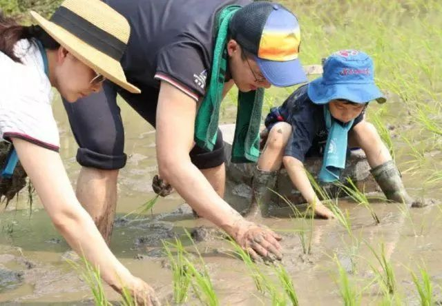 ·郭晶晶(左)和霍启刚带儿子体验插秧,这种朴素的带娃方式经常被媒体报道。