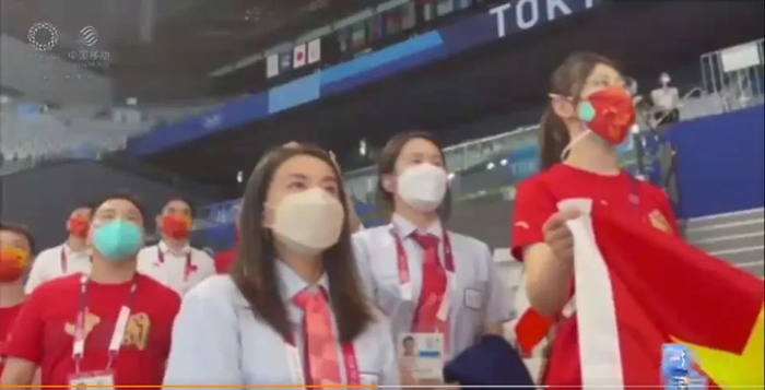 7月25日,女子双人三米跳板跳水比赛中,施廷懋、王涵为中国跳水“梦之队”本届的首金。赛后,郭晶晶在看台上与中国队一起唱响国歌↓↓