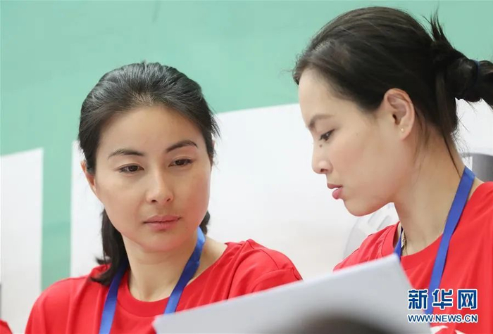 ·2018年,郭晶晶(左)、吴敏霞参加国际泳联国际级裁判评估项目。图自新华社。