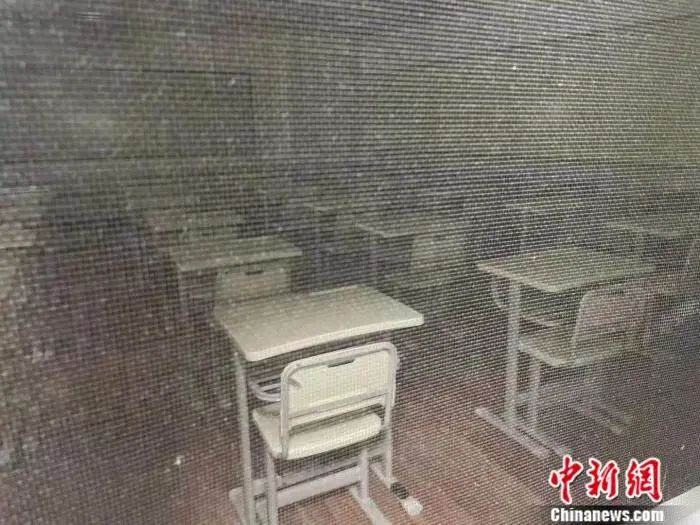 在北京海淀黄庄地区,透过纱窗可见某培训机构空荡荡的教室。