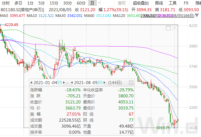 今年以来地产板块跌幅较大,自3月份开始持续一路走低,尤其是从5月底至7月底,几乎是一步一个脚印往下,基本没有像样的反弹。而近期市场轮动较快,多个板块个股开启下跌,但地产板块却止跌走强,底部形成迹象明显。Wind行情显示,7月底止跌以来,近期6个交易日已反弹超过2%,强于多个板块。