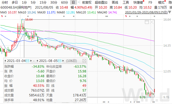 受利好影响,保利地产8月5日早盘大幅高开后快速拉升,盘中最大涨幅一度超过8%,随后股价有所回落,截至收盘,仍大幅上涨4.90%。
