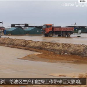 7月29日,中国石化集团公司在官方社交账号上发布视频。视频显示,中石化在新疆塔克拉玛干沙漠的一处勘探区被淹。油区道路多处冲堤溃坝,电线杆倾斜;中石化30000套设备、近50辆勘探车辆被淹,涉水面积300多平方公里。