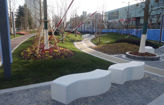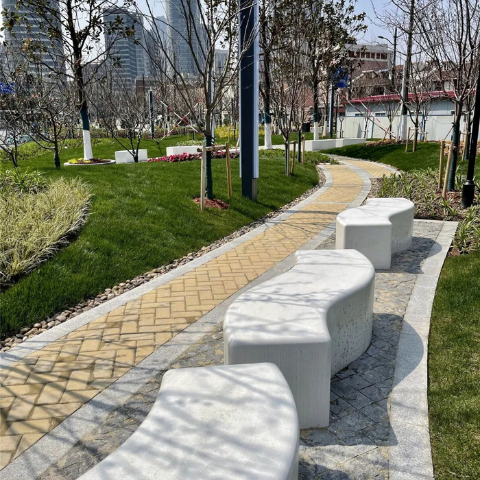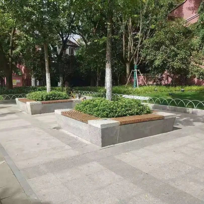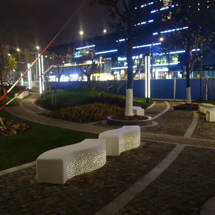 在平凉路绿地改造中,以“海绵城市、绿色环保”为主旨,打造微隆地形、端庄大方的游园绿岛,园内的定制款泰克石坐凳中设置小型灯具,扮靓公园夜景。