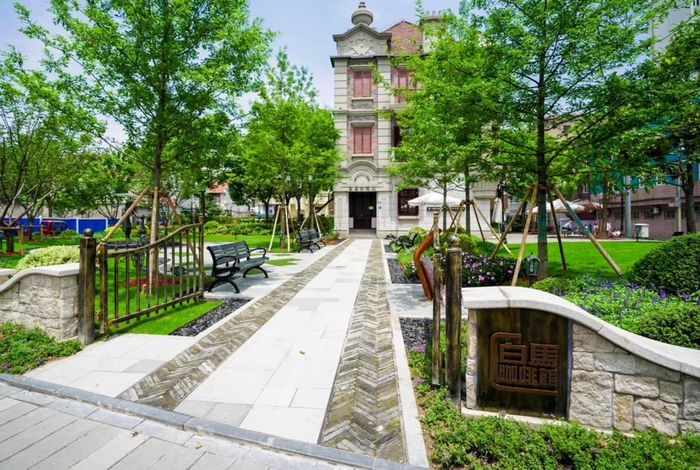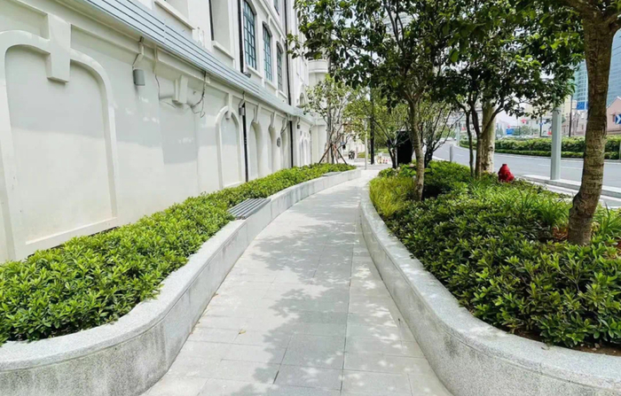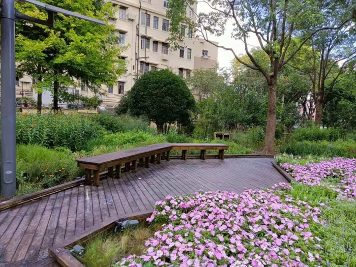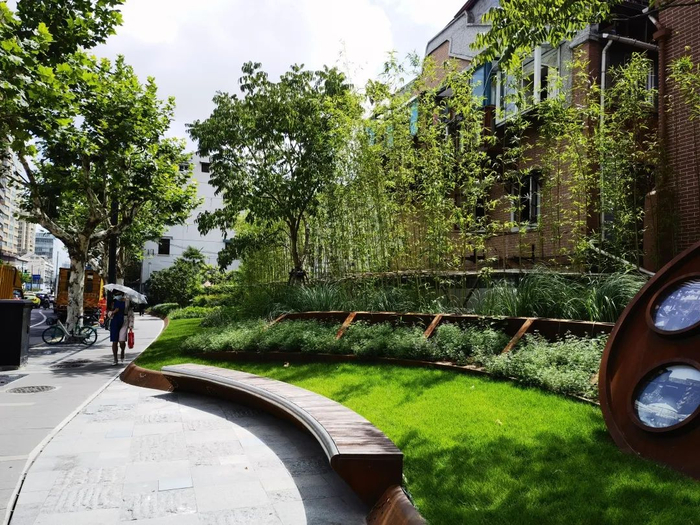 在长治路九龙路街头绿地改造中,设计方将人行道挪到绿地中间,并在道路两侧添置了新型的牛奶盒再生环保椅,让整个绿地动静结合,成为一个可漫步、可闲坐的街心花园。结合紧邻的北外滩建设者之家,一内一外的空间衔接赋予了这片区域更多的服务功能。