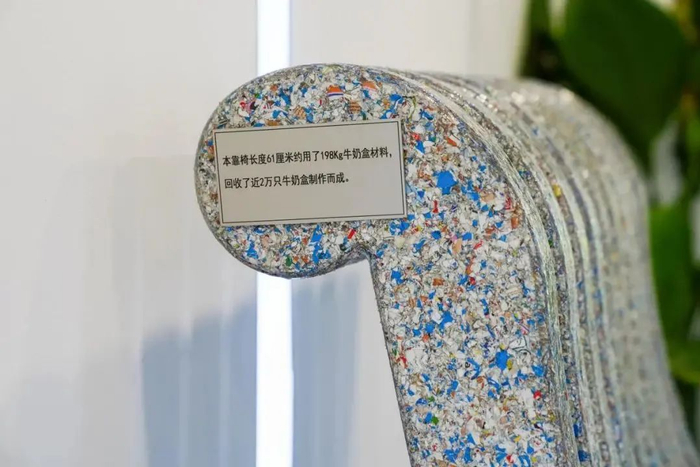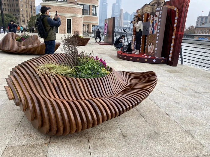 虹口滨江的景观家具采用了可再生材料制作,其中以置阳段最美滨江驿站侧边休闲坐凳为代表,其设计延续上海花博会中再生环保理念,使用了16万个回收牛奶盒作为材料进行加工处理。