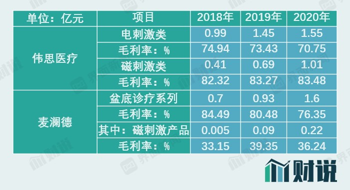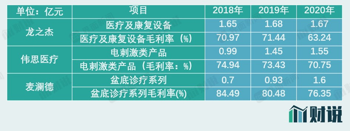 从伟思医疗、麦澜德、龙之杰电刺激类盆底产品营收规模看,增速普遍放缓,同时相关产品毛利率均处于下降趋势。麦澜德招股书解释称,2020年盆底诊疗系列毛利率较2019年下降,主要为积极应对市场竞争新推出单价相对较低的盆底诊疗系列,盆底诊疗系列单位售价下降所致。