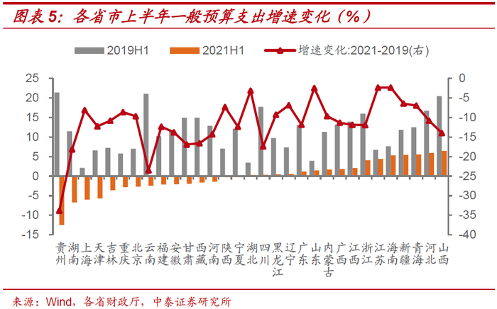 从全国层面看,上半年一般公共预算支出仅完成预算目标的37.4%,略高于受疫情影响较大的2020年,明显低于历年同期。一方面随着地方政府债务压力上升、项目投资审核趋严,支出安排有保有压,非重点、非刚性支出被明显压减;另一方面年初稳增长压力较小,政策安排存在跨周期调节、节约财力空间的考量。