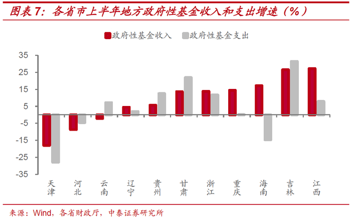 目前只有11个省份披露了上半年政府性基金收支情况。除天津、河北、云南等3省份政府性基金收入两年平均增速为负外,其余各省份均实现正增长。相对应的,除吉林、甘肃等4省份增速较高外,7个省份支出端表现较弱,甚至大幅下滑,明显受到上半年专项债发行节奏偏慢的拖累。