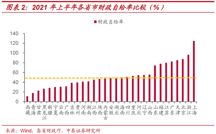 发达地区的财政自给率往往较高,属于财政贡献地区;而欠发达地区的财政自给率较低,支出依赖中央补贴。