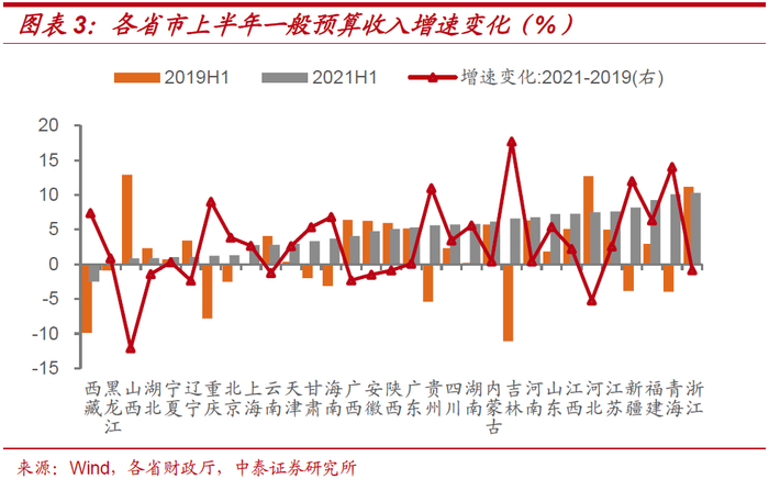 从上半年各省份一般公共预算收入增速(两年平均)看,31省份中只有西藏和黑龙江出现负增长,分别下降2.48%和0.02%。其余29个省份中,浙江、青海、福建、新疆等省份增速排名靠前,均在8%以上。和2019年同期相比,22个省份上半年财政收入增速回升,表明上半年经济恢复取得一定成效;山西、河北、辽宁等9省份增速下滑,或因经济结构性问题短期难解,财政“开源”压力较大。