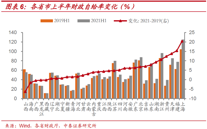考虑到简单计算一般财政收支缺口并开展横向比较的方式不够客观,我们认为纵向对比能够更充分地反映各省份的财政变化。需要注意的是,我们选取的对比基期是2019年上半年,同时今年增速采用两年平均增速,从而避免2020年疫情冲击带来的低基数扰动影响。具体的指标口径包括:一般公共预算收入增速、一般公共预算支出增速、财政自给率。