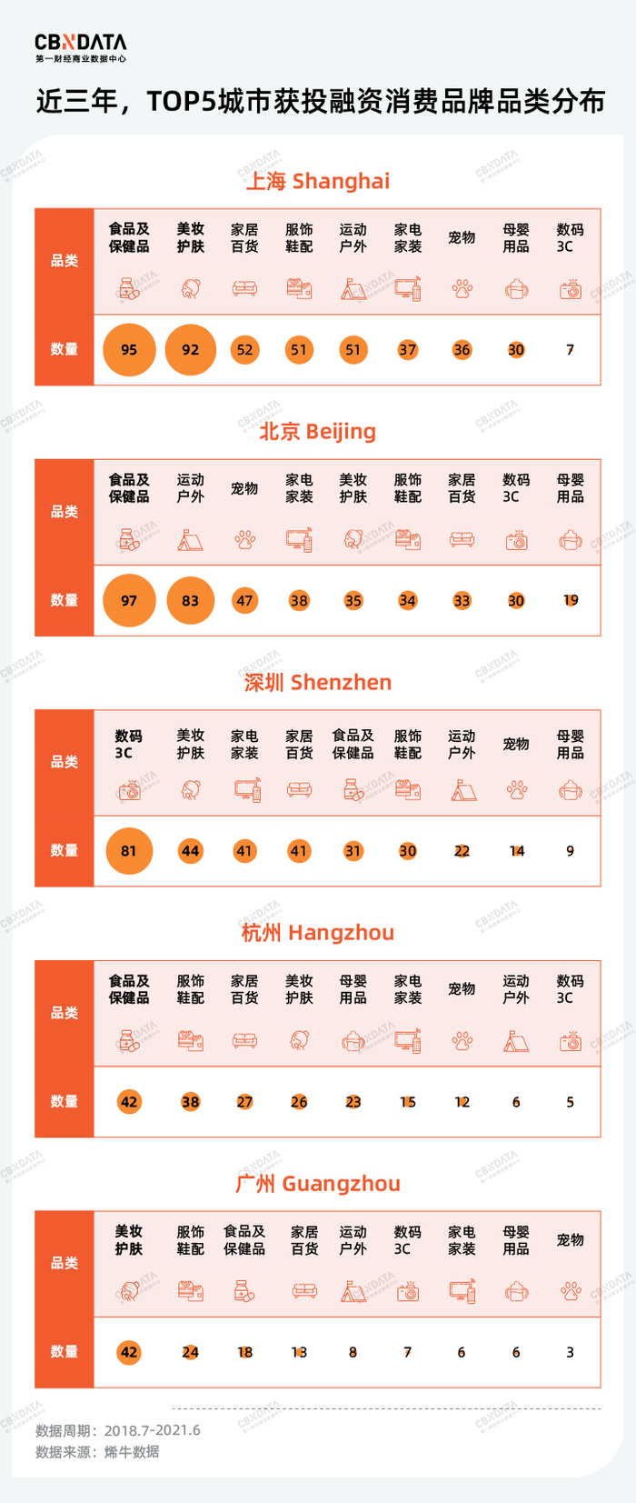 从具体的品类分布来看,近三年食品及保健品、美妆护肤一直是最受欢迎的两大赛道。当其他城市或多或少显现出其在某一赛道的强势(例如北京的食品类品牌备受欢迎,广州的美妆护肤优势明显,深圳的数码3C更为抢眼),而上海不仅同时抓住两大高热赛道,而且在家居百货、服饰鞋配、运动户外品类的资本吸引度同样优于其他城市。