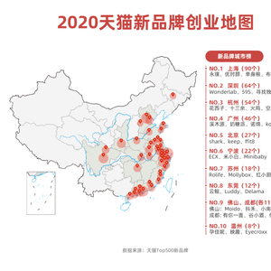 2020年天猫发布的新品牌图鉴显示,天猫Top500新品牌的所在地大部分集中在一二线城市,其中,上海以90个的数量位居新品牌城市榜首。