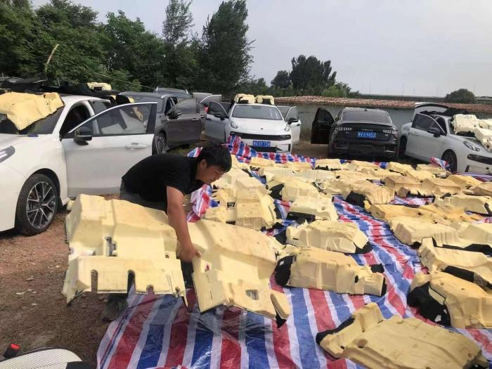 7月30日上午,当21世纪经济报道记者来到位于郑州市惠济区的河南汽车贸易中心,各家4S店门口摆满了等待处理的受损车辆,到处是被拆卸下来单独晾晒的车底隔音棉、座椅。