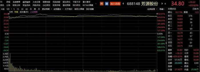 8月6日,芳源股份正式“转板”科创板,上市首日该股盘中最高暴涨逾7.5倍,最终收于34.8元,涨幅为659.83%,以此计算该股总市值为177亿元,较新三板摘牌前市值增长逾8倍。