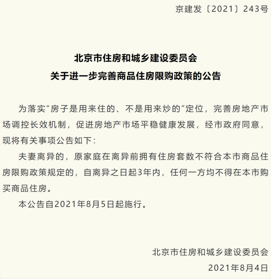 8月5日,北京市住房和城乡建设委员会印发《关于进一步完善商品住房限购政策的公告》(下称《公告》),明确自8月5日起,夫妻离异的,原家庭在离异前拥有住房套数不符合本市商品住房限购政策规定的,自离异之日起3年内,任何一方均不得在本市购买商品住房。