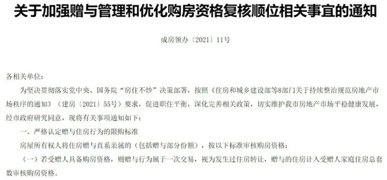 除北京外,成都住建局也在同日发布《关于加强赠与管理和优化购房资格复核顺位相关事宜的通知》(下称《通知》)。