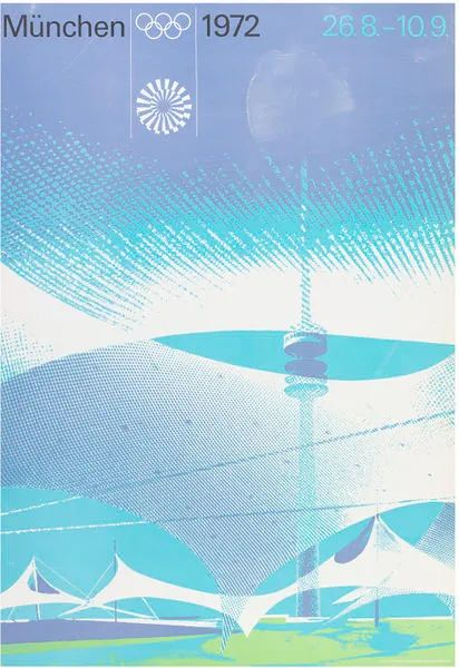 1972年的慕尼黑奥运会海报在设计师奥托·艾舍(Otl Aicher)的领导下,成为了一个对抗1936年纳粹统治下的柏林奥运会的视觉记忆的契机。海报配色中没有黑色或红色,而是以白色、浅蓝色、绿色、橙色和银色组合呈现,彻底摒弃了柏林奥运会海报设计的戾气。在东京、墨西哥城和慕尼黑奥运会上,纯粹的设计质量成为彰显国家成就的一部分。时至今日,这三届奥运会仍然常被平面设计师们挂在嘴边,认为它们是卓越的平面设计和跨文化交流理想的集大成者。