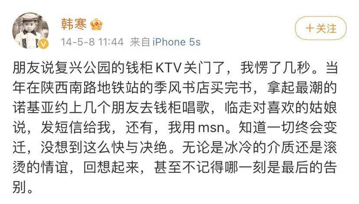 2014年,钱柜上海复兴公园店宣布停止营业时,韩寒在微博上怅然若失: