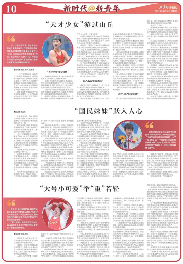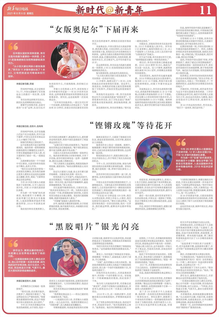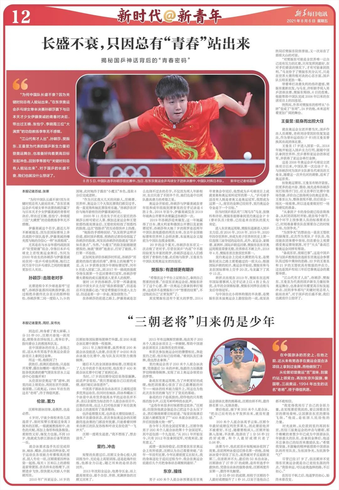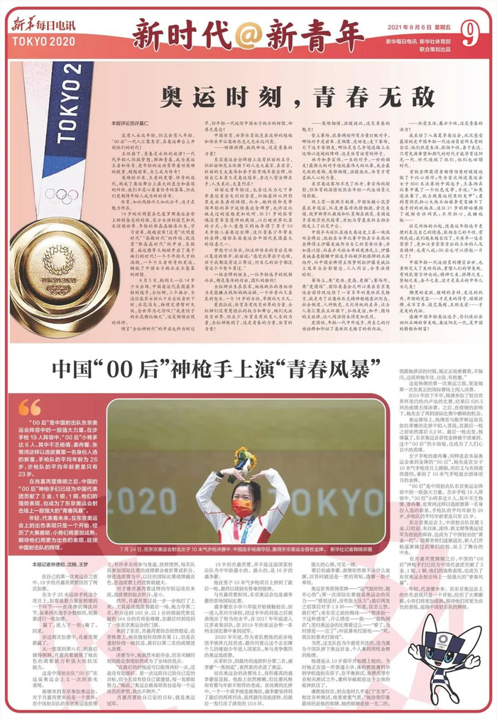 【编者按】没有人永远年轻,但总会有人年轻。“00后”一代人汇聚东京,在奥运舞台上开创他们的时代!五环旗下,青春是永恒的旋律!一代代年轻人怀揣梦想,挥洒青春,成为奥运王者和传奇。我们不忍心看着传奇的落幕,但我们更期待年轻人成为新的传奇。8月6日,《新华每日电讯》副刊部与融媒中心联合推出第3期《新青年@新时代》青春特刊,与您一起关注奥运赛场上的中国青年!