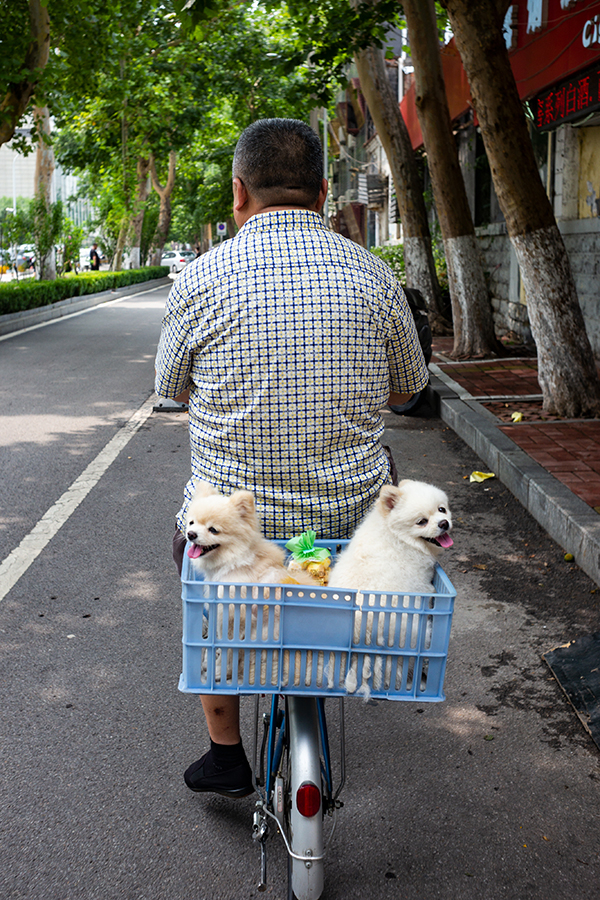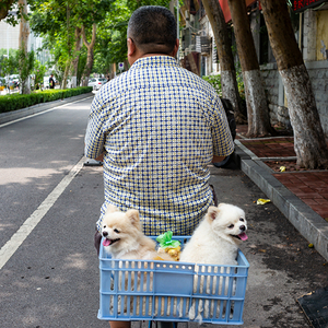 2021年7月15日,济南纬一路,骑车的老者身后塑料筐内站着两只小狗。人民视觉 资料图