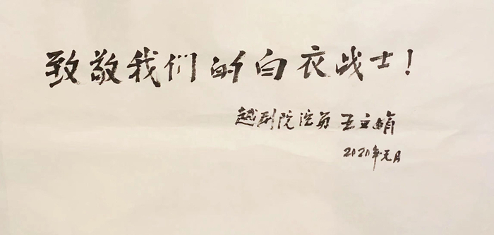 她特别热衷于公益事业,我记得1998年水灾,那时候我专门陪她跟其他一些越剧老艺术家徐玉兰、毕春芳等去慰问。去年年初有疫情了,她就给我打电话说,医务人员很辛苦,她说不知道能做什么。我说你那么大年纪你做不到什么,写一张字来表达一下对医务人员的崇敬之情。她说我字比较写得不好,我说没关系,是表达一个心意,就写一个“向医务人员致敬”,后边落款她写得特别谦虚:上海越剧院演员王文娟。