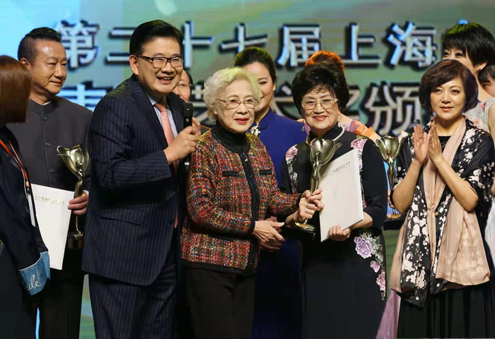 2017年4月7日晚,第27届上海白玉兰戏剧表演艺术奖颁奖晚会,秦怡为王文娟颁发终身成就奖。