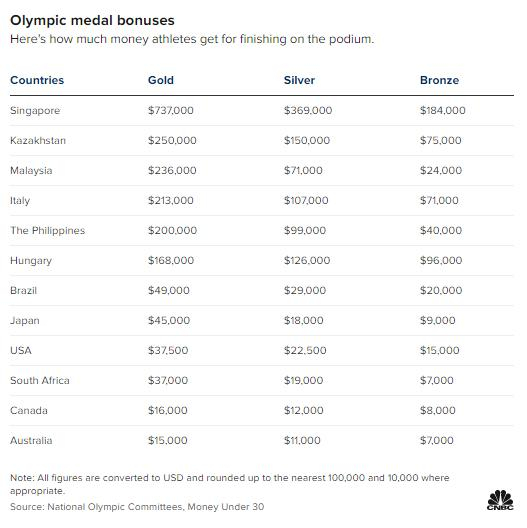 除了以上各式各样的礼物,还有一个奖励最重要,钱。对于运动员来说,一枚奖牌不仅能为国家带来荣誉、证明自己的能力,也能为他们以后的职业发展提供额外帮助——训练、康复都需要资金,而奖牌能带来额外奖金。福布斯指出,不少国家都愿意为获得奖牌“付出一切代价”,但这也带来了各国支持力度不均、穷国无力发钱的不平等现象。