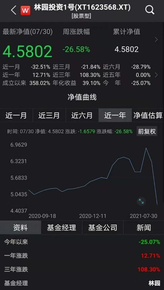 Wind资讯显示,林园管理的代表性产品林园投资1号,今年7月份的月度跌幅高达26.58%,6月份跌幅也超过8%。从今年年内表现看,前7个月跌幅超过25%。