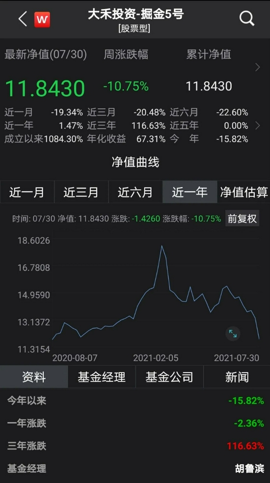 以该公司的大禾投资-掘金5号为例,成立于2016年10月的该产品, 2017年净值上涨85%。在市场惨淡的 2018年,其净值再度上涨近一倍。2019年涨幅更是高达119%,2020年净值再度上涨67%。在今年2月初,净值飙升至18.1元。短短四年多时间,总回报近18倍,堪称逆天。