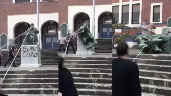 波特兰中学前的杰斐逊雕像被示威者拉倒的视频静帧