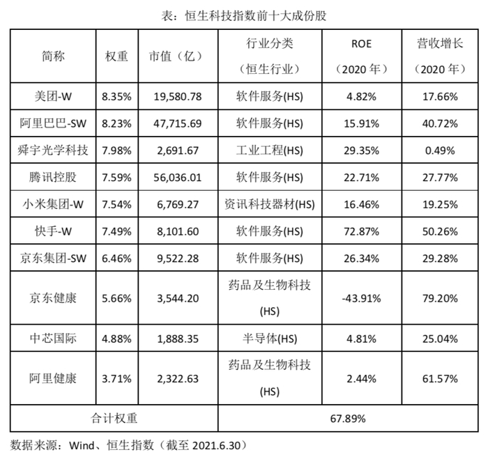从成份股质地来看,恒生科技指数成份股质地较为优良。其中前十大成份股合计权重占比67.89%,持股集中度相对较高。而从盈利成立和成长性来看,前十大成份股中平均净资产收益率(ROE)为15.18%,营收增速均值为35.12%,均显示了指数成份股质地优良。