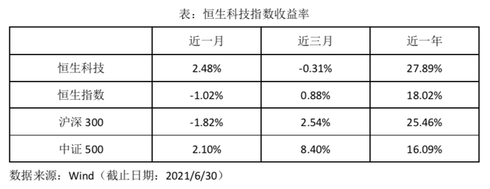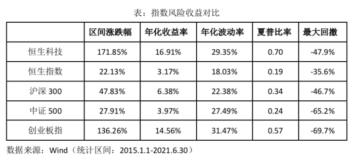 从历史收益来看,自基日以来截至2021年6月30日收盘,恒生科技指数累计收益率171.85%,年化收益率16.91%,优于恒生指数、沪深300指数、中证500指数以及创业板指。在综合风险指标后,恒生科技指数夏普比率为0.70,同样优于其他三只指数。