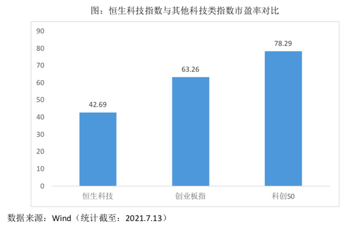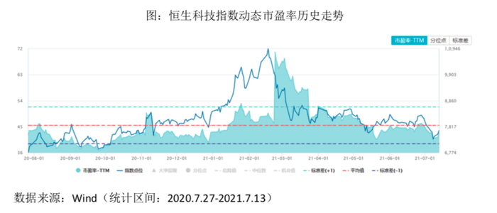 从估值来看,截至2021年7月13日,恒生科技指数动态市盈率PE(TTM)为42.69倍,位于指数2020年上市以来36.71%历史分位数,纵向来看,指数估值仍处于较为合理的位置。