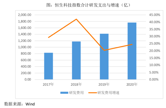 研发支出是预测企业未来发展前景的重要指标之一。从恒生科技指数的研发支出来看,自2017年以来,其成份股研发支出长期保持增长,即使在2020年疫情的背景下,指数成份股合计研发支出达到了1763.3亿港元,同比增加24.47%。