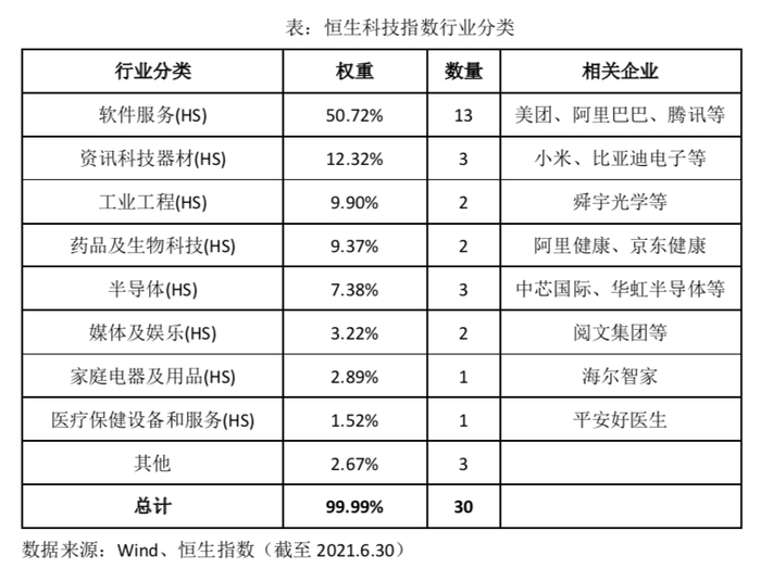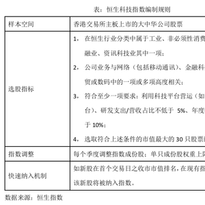 恒生科技指数追踪经筛选后的最大30间香港上市的科技企业。恒生科技指数的选股范畴主要涵盖与科技主题高度相关上市公司,包括网络、金融科技、云端、电子商贸及数码业务。指数选股准则并会考虑符合资格公司是否利用科技平台进行营运、研究发展开支占收入之比例及收入增长。该指数以2014年12月31日为基日,截至2021年6月30日收盘,恒生科技指数共包含30只成份股,平均个股市值6256.64亿港币。