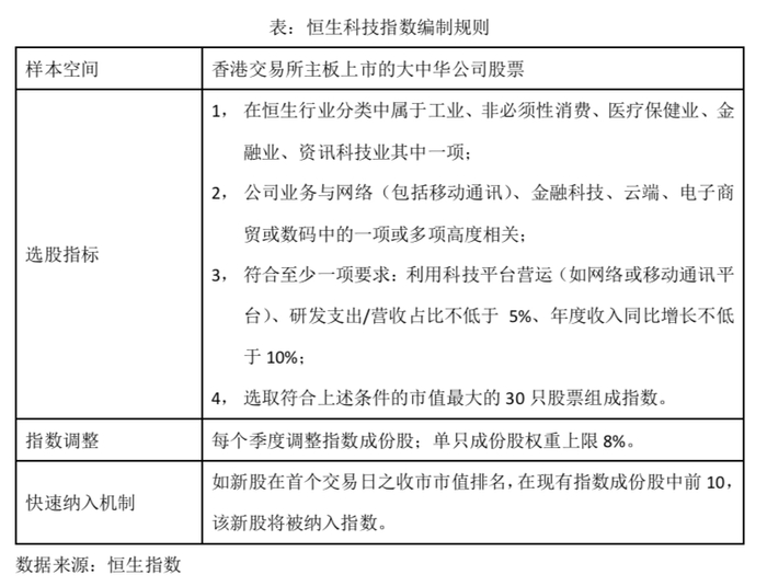此外,恒生科技指数采用了“快速纳入机制”,若符合条件的新股上市首日市值在现有成份股中排名前十,则将会在该新股上市后的第十个交易日收市后将其纳入指数。