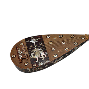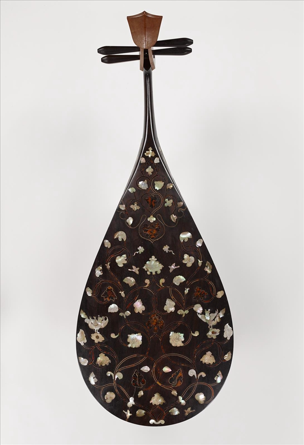 求嘉木于五岭,取殊材于九折。剖文梓而纵分,割香檀而横裂。若乃琢玉范金之巧,雕文镂采之奇,上覆手以悬映,下承弦而仰施。帖则西域神兽,南山瑞枝,屈盘犀岭,回旋凤池。——唐虞世南《琵琶赋》