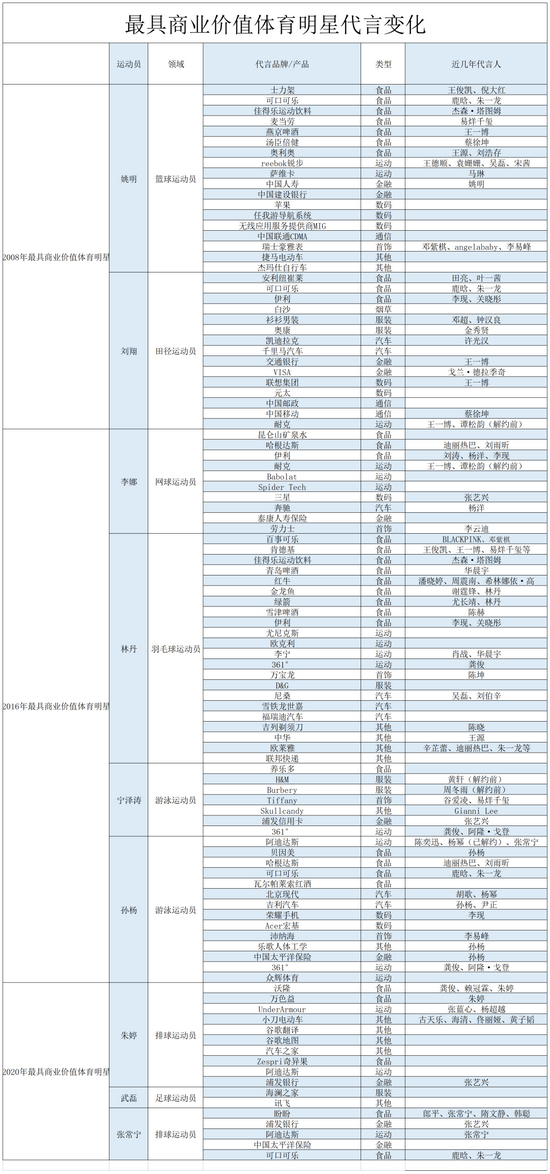 最具商业价值体育明星代言变化。根据公开资料整理。制图:夏雪