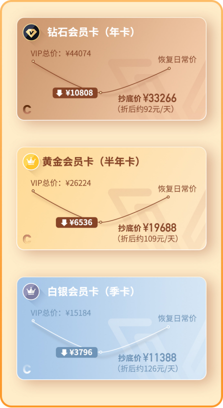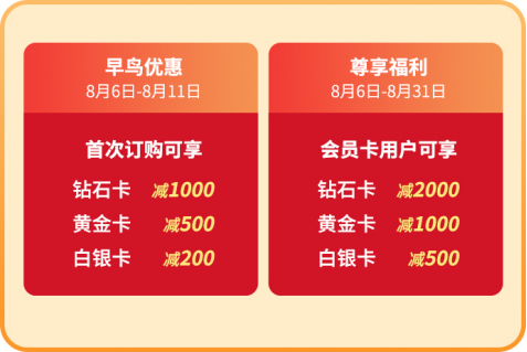 如果您之前未曾订阅过会员卡,本轮可享受价格直降+早鸟优惠,原价44074元的钻石会员卡,到手仅需32266元,劲省11808;如果您是曾订阅过VIP会员卡的用户,可享受价格直降+尊享优惠,续订钻石卡仅需31266元,劲省12808