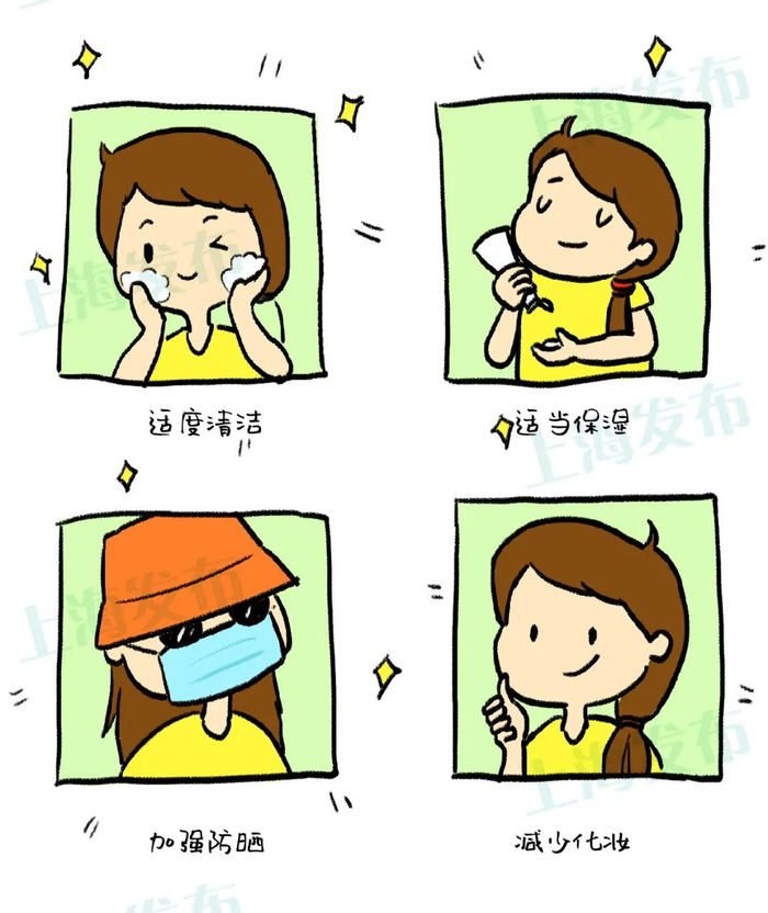 加强防晒:紫外线对皮肤有致命的损伤。为了保护我,大家一定要加强防晒,每天擦温和的物理防晒霜,并配合使用防晒口罩、帽子和墨镜等。