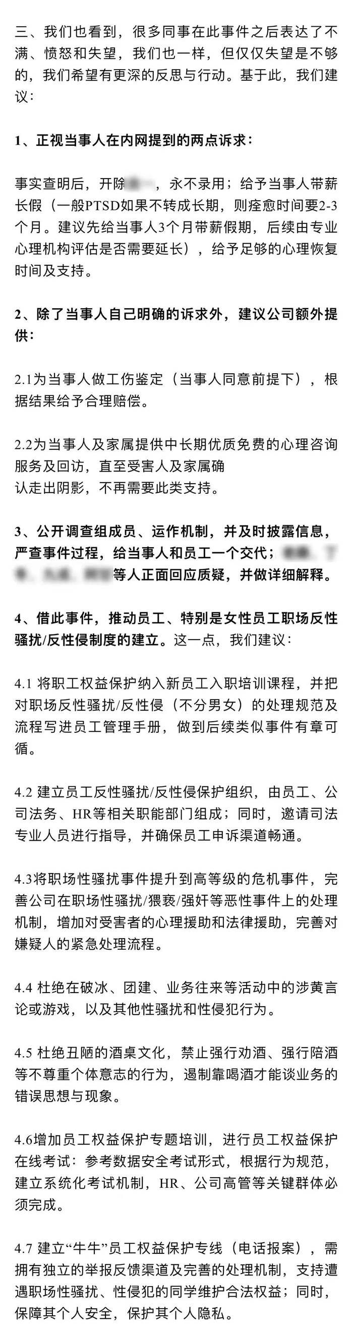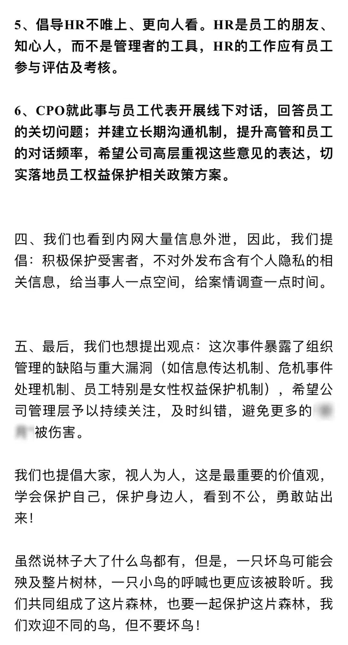 倡议中提及,希望公开调查组成员、运作机制,并及时披露信息,严查事件过程,给当事人和员工一个交代,令涉事高管正面回应质疑,并作详细解释。此外,在女性员工职场反性骚扰制度、倡导HR不唯上更向人看、CPO与员工建立长期沟通机制等方面,这份倡议也提出了具体诉求。