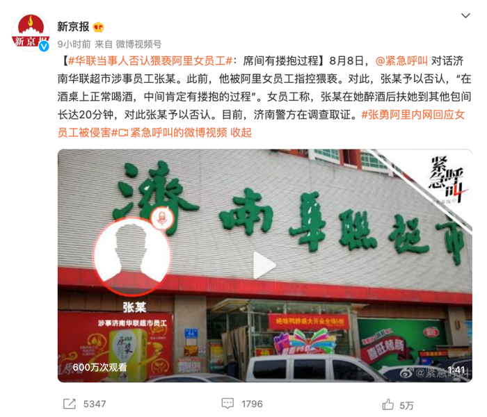阿里女员工在济南出差期间被侵犯一事仍在发酵。