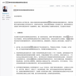 阿里巴巴集团首席人力资源官童文红受到记过处分。在整个事件处理过程中,HR团队对人的关注、关怀不够,理性多了,感性少了,缺乏感同身受。同时,缺乏应急响应体系和存在严重的判断失误,在涉嫌刑事案件的情况下,未能第一时间将当事人停职。“这种种现象的背后是HR文化体系和能力的建设出现了重大问题。”